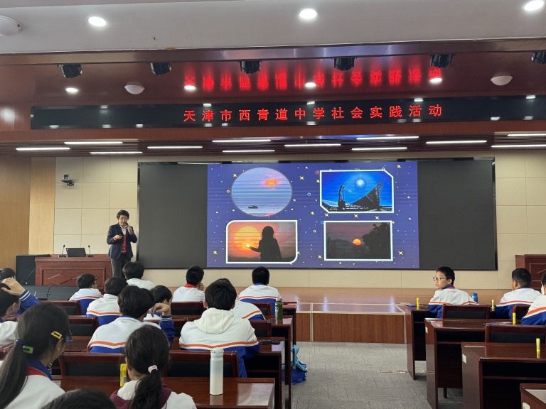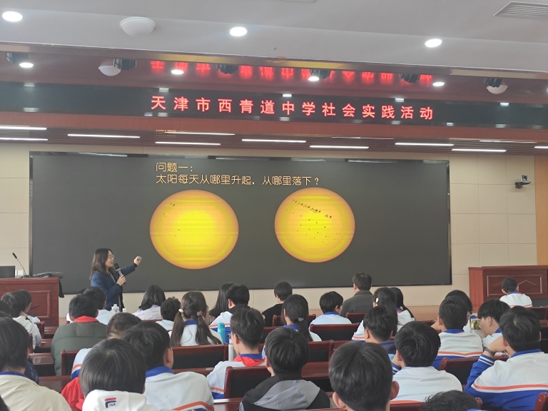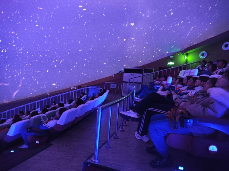 在一二层展厅,同学们近距离观察力学、光学相关展品,通过直观体验理解科学原理,动手操作各类互动装置,感受科技的趣味性与实用性;A区三楼报告厅内,《探秘太阳》天文课程干货满满,天津市天文学会的专业讲解带大家解锁太阳的神秘面纱,建立对宇宙天体的科学认知;宇宙剧场中,《宇宙大冒险》影片以震撼的视听效果,让学生们“穿梭”于浩瀚星空,拓宽宇宙视野。
