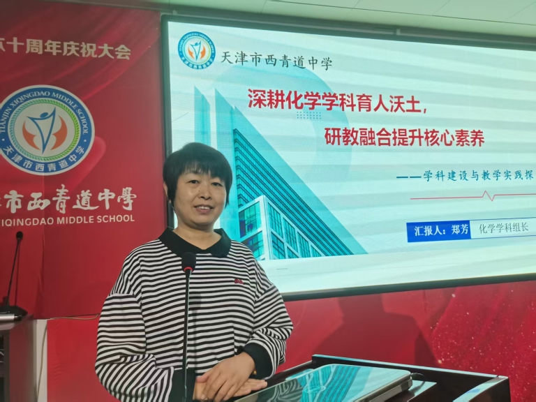 学科组建设是教科研落地的重要载体。化学组组长郑芳老师以“深耕化学学科育人沃土,研教融合提升核心素养”为主题,分享了学科组在课题攻坚、教研活动开展等方面的宝贵经验。对于化学组如何打造特色课堂,实现学生成绩稳居前列、素养提升,教师向研究型跨越进行深入的阐述。