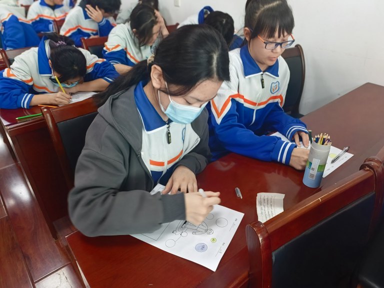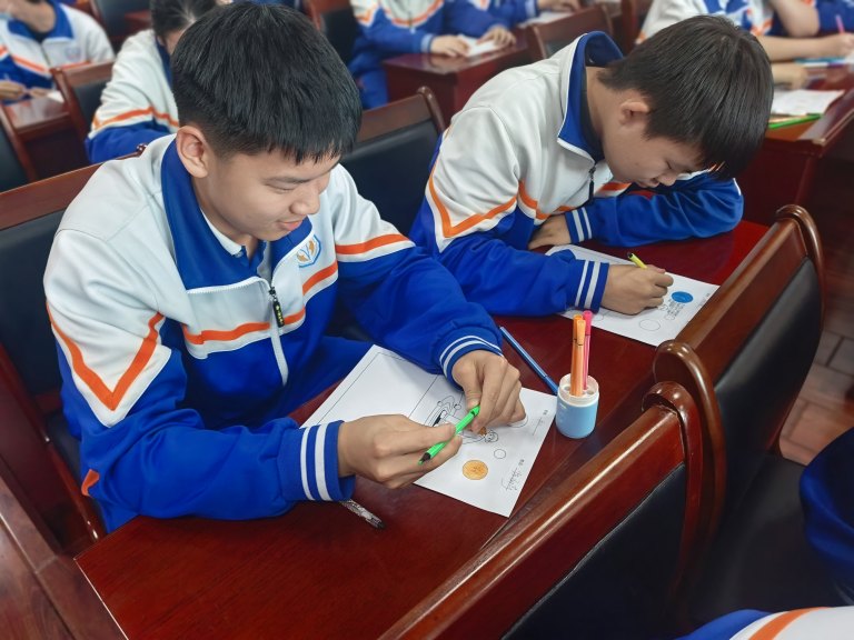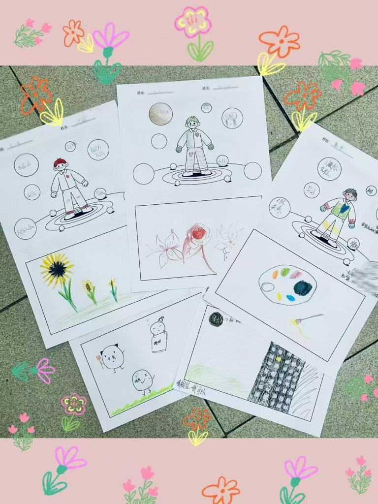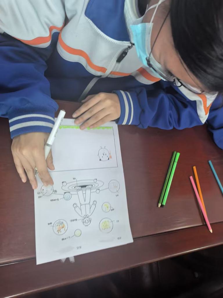 在“画小人圈压力”环节,同学们拿起画笔,将内心的焦虑、担忧等压力情绪,以具象化的图案呈现在画纸上,并主动分享自己的“压力小人”。这一环节让抽象的压力变得可感可知,不仅帮助同学们完成了对自身压力的深度觉察,更通过压力分类梳理,强化了“正视压力、不避困难”的心理勇气。