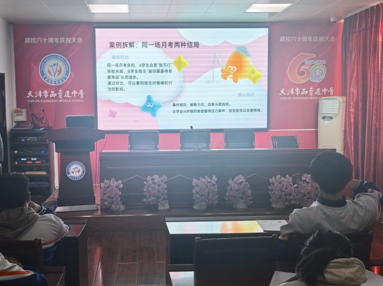 针对如何科学调节情绪,带来了“ABC+3I”认知调节工具箱。通过讲解和案例示范,引导同学们尝试转变看待问题的角度,学会用积极的视角审视学业困境,并用正向自我暗示肯定自身努力与进步。