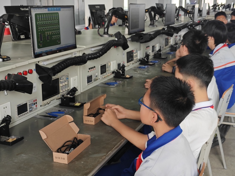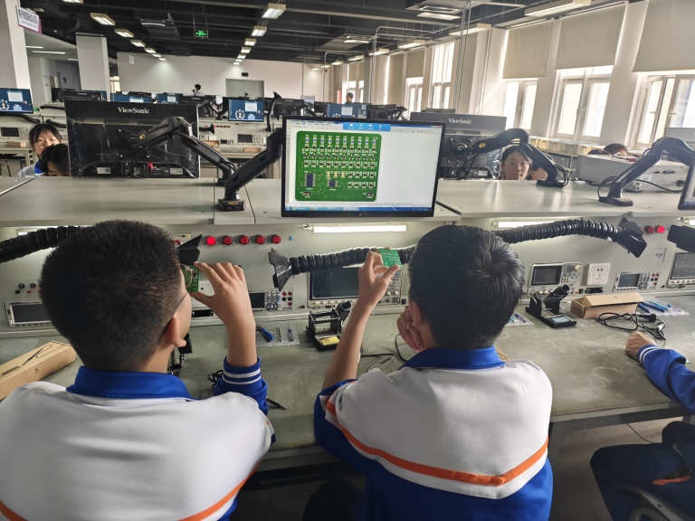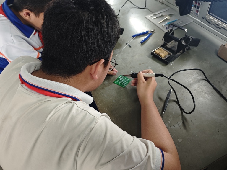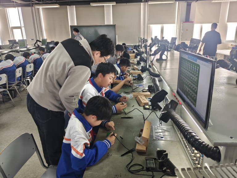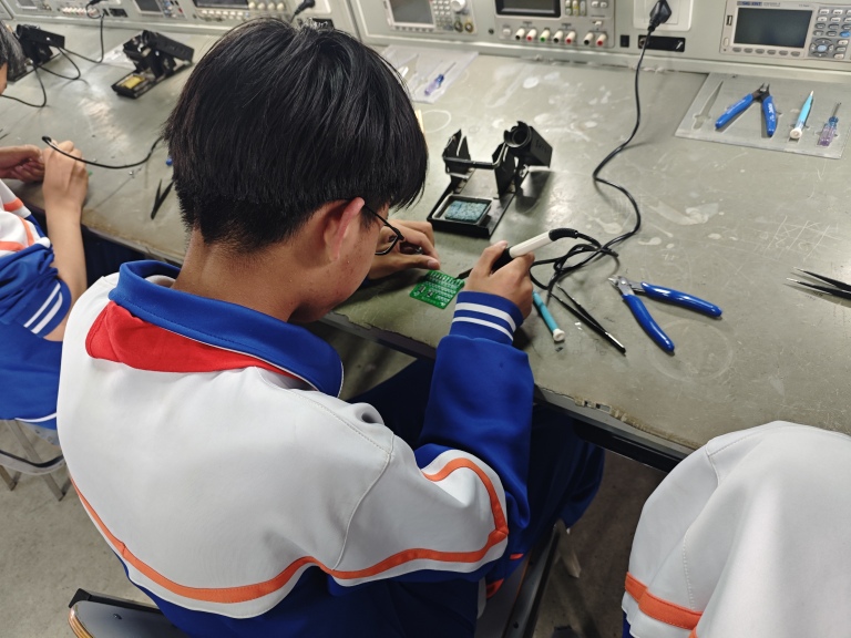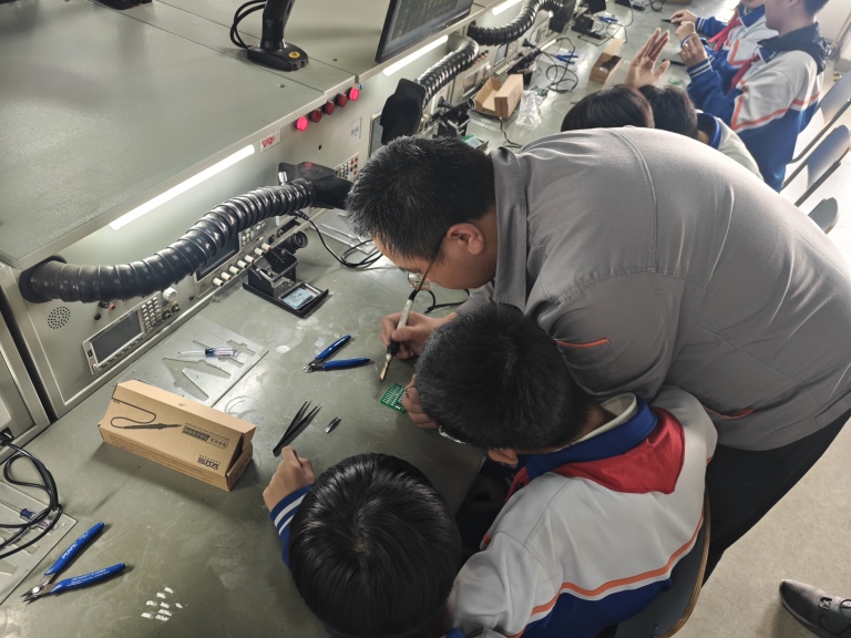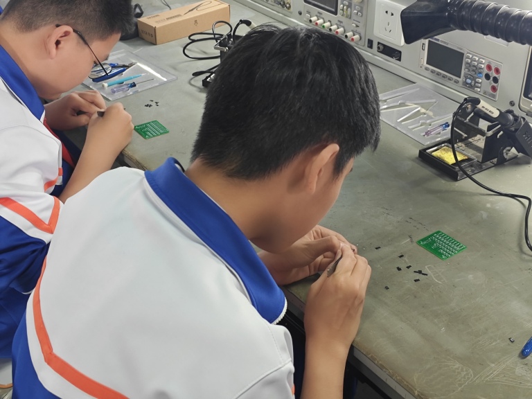 在电子元件焊接实践课堂上,同学们迎来了本次研学最具挑战性的环节。指导老师从电烙铁的正确使用方法、焊锡丝的熔化技巧、焊点的质量标准等基础知识点讲起,手把手地教同学们进行焊接操作。从最初的紧张手抖、焊点不规整,到逐渐掌握技巧、焊出整齐美观的焊点,同学们在一次次尝试中体验着动手实践的乐趣。同学们纷纷表示,看似简单的焊接操作,实则需要极大的耐心和专注力,这让他们深刻体会到了"差之毫厘,谬以千里"的工程严谨性。